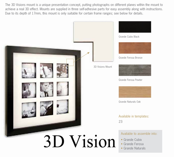 The Cubix is one of the best selling frame ranges, these block moulding’s offer an uncluttered and contemporary finish. The accompanying mount features a matching inset colour within its three dimensional design, whilst the Grande Cubix mount offers one of the most elegant features of a hand-wrapped deep fillet with a colour inset.