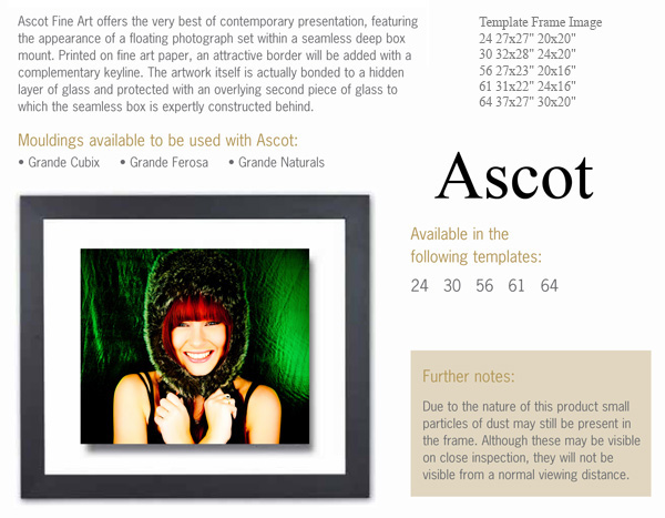 Ascot Fine Art offers the very best of contemporary presentation, featuring the appearance of a floating photograph set within a seamless deep box mount. Printed on fine art paper, an attractive border will be added with a complementary key line. The artwork itself is actually bonded to a hidden layer of glass and protected with an overlying second piece of glass to which the seamless box is expertly constructed behind.