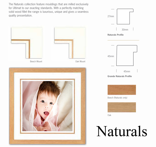 The Naturals wood moulding available in two finishes. Each finish adjoins two metallic colours for a unique combination and coupled with a simple multi-layered mount, the overall presentation is clean and highly suitable for a variety of photography.
